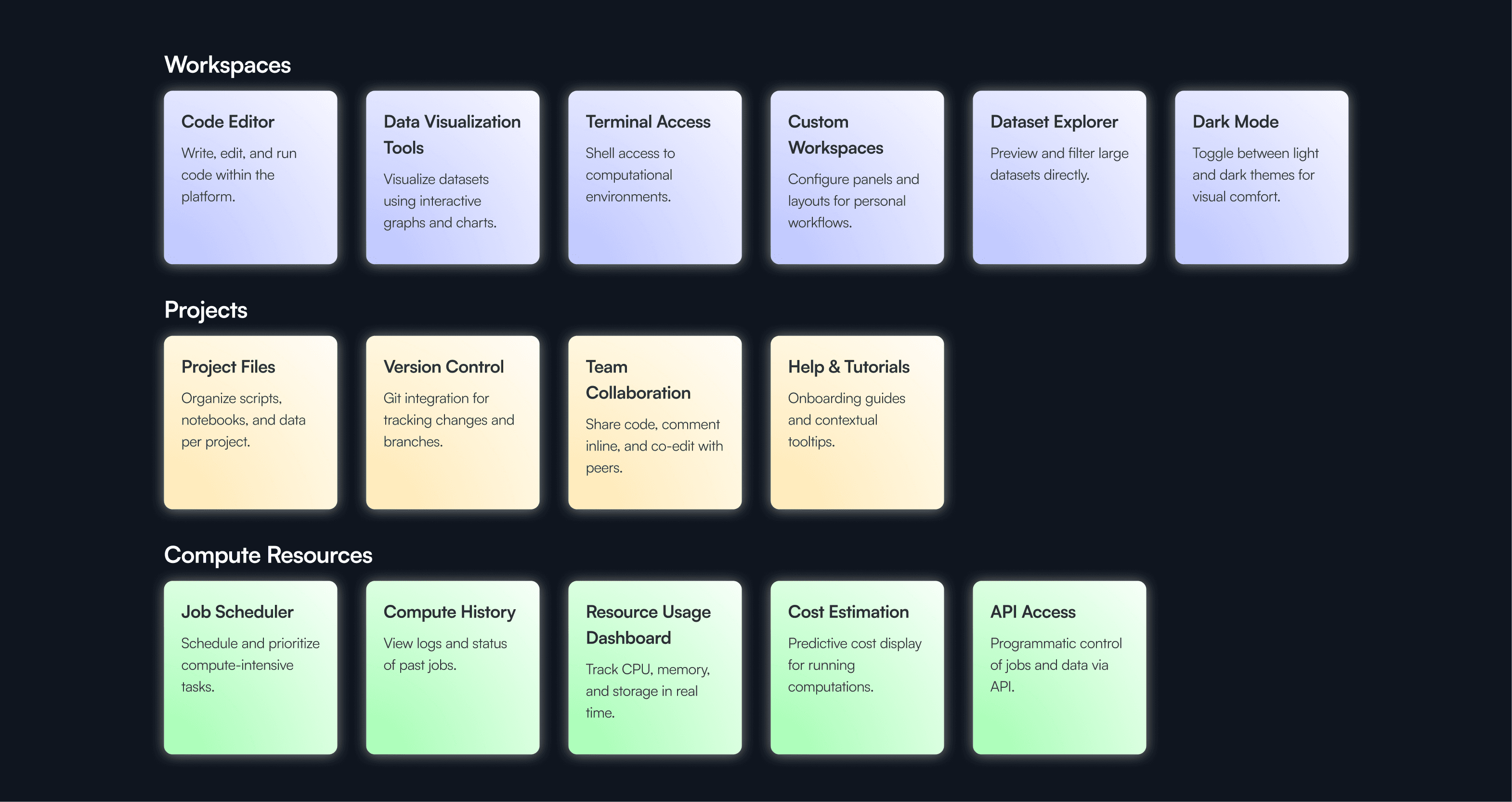 Dashboard Simplification: A one-glance overview of active projects, running computations, and available resources.